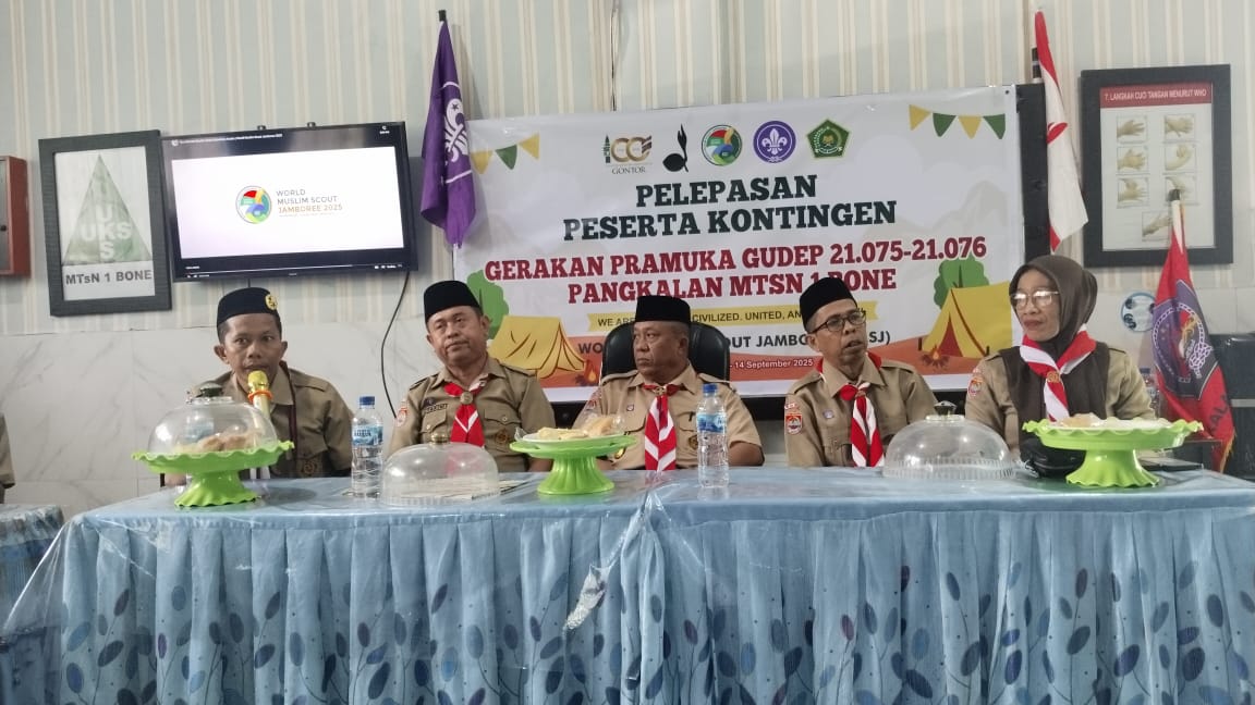 Watampone, (Kemenag Bone) – Sebanyak 13 peserta kontingen Gerakan Pramuka Gugus Depan 21.075–21.076 Pangkalan MTsN 1 Bone resmi dilepas untuk mengikuti kegiatan World Muslim Scout Jamboree, sebuah perkemahan besar berskala internasional yang mempertemukan pramuka dari negara-negara berpenduduk mayoritas Muslim maupun negara lain yang memiliki organisasi kepanduan Muslim. Acara pelepasan dilaksanakan di ruang kelas MTsN 1 Bone, Kamis, (4/9/2025).